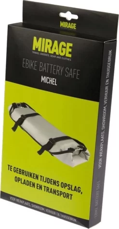 Een Ebike lithium-ion accu is opgebouwd uit diverse cellen. Als deze accu tot ontbranding komt is het vrijwel niet te blussen. De brand ontstaat meestal bij één cel, maar gaat als een kettingreactie door de hele accu heen. Dit gaat met explosies gepaard waarbij enorme hitte (tot wel 1200°) en rook vrijkomt. Met het ontwerp van de Mirage Ebike Battery Safe Michel hebben wij een tas ontwikkeld, welke gemaakt is van zware brandwerende stof, die sterk genoeg is om de hitte tot 1200° en de hoge druk, die vrijkomen als een fietsaccu in de brand gaat, aan te kunnen. Er zijn verschillende tests uitgevoerd door de firma Efectis – een wereldwijd erkend bedrijf op het gebied van brandveiligheid. Zowel door de bijzondere constructie als de brandwerende stof waar de tas van gemaakt is, is de tas goed uit de uitgevoerde testen gekomen. Voor deze testen is gebruik gemaakt van zware Ebike accu’s, die tot ontbranding zijn gebracht. Een accu is en blijft een onvoorspelbaar explosief product als deze tot ontbranding komt. Het goed opvolgen van de vouwinstructies, en het in acht nemen van de adviezen met betrekking tot opslag, laden of transport, zijn derhalve van essentieel belang om de kans op brand in de omgeving van de batterij zo klein mogelijk te maken. De Mirage Ebike Battery Safe is de oplossing voor het veiliger opslaan en laden van Ebike accu’s.