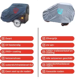 Deze Bakfietshoes Bakfiets (met huif) – Red Label is licht van gewicht en beschermt uw bakfiets tegen regen, stof, UV en vorst. Ook beschikt de hoes over een slotgat om uw bakfiets met een kettingslot te beschermen. Deze bakfietshoes is geschikt voor meerdere modellen zie onderstaand lijstje.