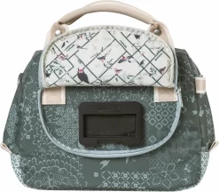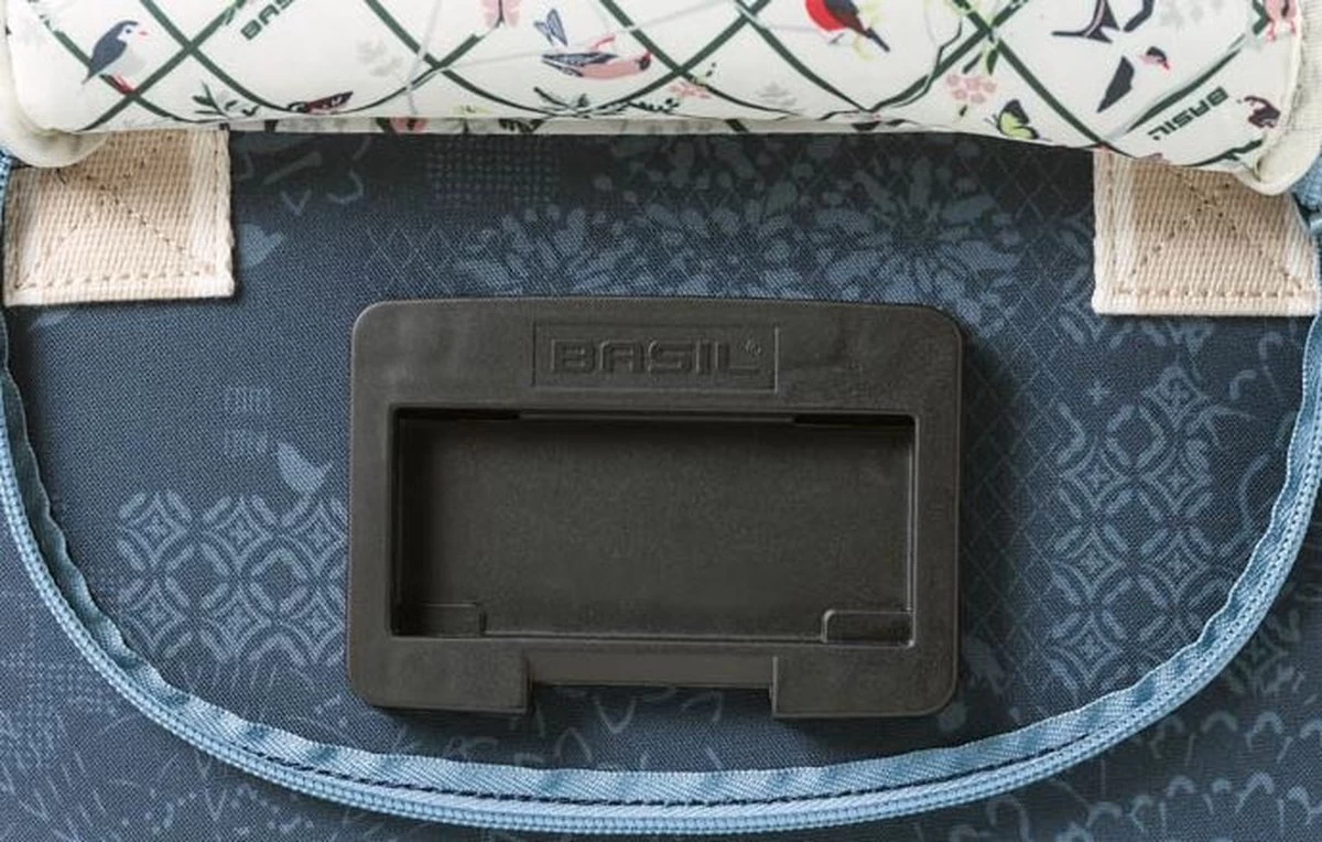 De Basil Bohè;me City bag is een elegante blauwe hand-, schouder- en stuurtas in è;è;n, met stijlvolle bohemien print. Een fietstochtje naar het terras in de stad of een middagje shoppen met die vriendin, je kan al snel niet meer zonder deze Bohè;me City Bag. De tas heeft een stevige binnenvoering, een ritsvak en een inhoud van 8 liter. Ruimte genoeg dus voor je dagelijkse benodigdheden zoals een flesje water, je portemonnee en lunch. Door het waterafstotende polyester blijven je spullen droog tijdens een kleine regenbui. De kunstlederen details en de vrolijke bohemienprint met grafische kruissteekpatroon en vogelsilhouetten, zorgen voor een trendy uitstraling. Door het afneembare schouderhengsel, is de tas ook als schoudertas te dragen. De tas is vast te maken dankzij de voorgemonteerde KF adapterplaat. In het donker ben je beter zichtbaar door de reflectiedetails. De Basil Bohè;me City Bag is ook verkrijgbaar in de kleuren rood en groen. Deze tas onderdeel van de Basil Bohè;me collectie. Zo heeft deze elegante Bohème lijn ook een dubbele tas, een grotere schoudertas en bijpassende fietsaccessoires. Eigenschappen: Je valt extra op in het donker door de reflectiedetails. De tas is van waterafstotend materiaal waardoor die ook tegen een kleine regenbui kan, maar zal na een hele dag in de regen niet meer kurkdroog zijn. Afneembaar schouderhengsel waardoor je de tas als schouder-, hand- of stuurtas kan gebruiken.