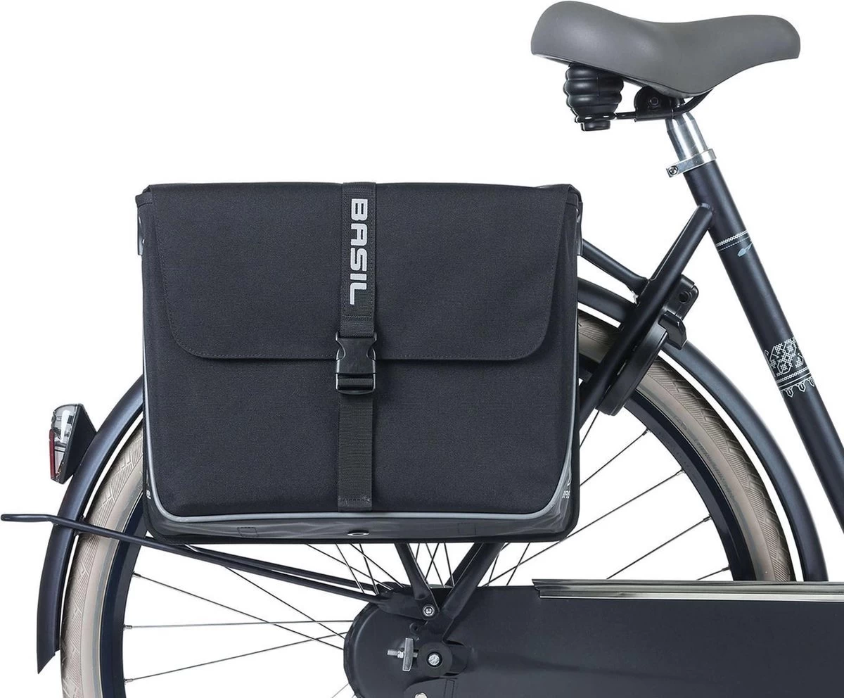 De Basil Forte Double bag is een praktische dubbele fietstas waar je veel boodschappen in mee kunt nemen. Handig voor als je na je werk nog even snel de boodschappen voor de avond wilt halen. De tas is gemaakt van waterafstotend polyester in combinatie met tarpaulin. Daarbij heeft de tas een extra stevige constructie. Een echte krachtpatser dus! De Forte Double bag is voorzien van een aansnoerband en verstelbare sluiting. Dankzij de reflectie op alle zijden én een extra lange reflective piping, ben je beter zichtbaar in het donker. Je bevestigt de dubbele fietstassen makkelijk achterop jouw fiets met het Universal Bridge system. Ook op de bagagedrager van je elektrische fiets. Het systeem maakt het mogelijk om de tas op drie manieren te bevestigen: Vaste montage: met behulp van de meegeleverde riempjes. Afneembaar: in combinatie met een adapterplaat. Geschikt voor adapterplaten van MIK, Racktime, i-Rack/Carrymore. Deze adapterplaten dien je apart aan te schaffen. Afneembaar: in combinatie met het DBS- detachable bag systeem. Heb je een kinderzitje op je fiets? Combineer dan de Forte Double bag met de Basil Carrier extender. Met deze handige extender ‘verleng’ je jouw bagagedrager en kun je de Forte double bevestigen. Ben je op zoek naar een andere kleur? Bekijk dan de Forte Double bag in een donkerblauwe kleur. Tip: combineer de Forte double bag in het zwart met de Basil afstandhouder (apart verkrijgbaar). Hiermee voorkom je dat de tas (vooral met zwarte boodschappen) in de spaken van je fiets komt. Eigenschappen: Met de 35 liter ruime zwarte dubbele fietstassen heb je altijd voldoende ruimte bij de hand. De extra stevige constructie maakt de tas een echte krachtpatser. Waterafstotend materiaal houdt de inhoud van jouw fietstassen droog. De reflectie zorgt voor een betere zichtbaarheid in het donker.
