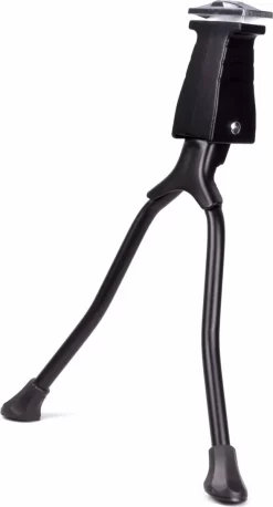 De dubbele fietsstandaard zorgt voor nog meer stabiliteit dan een enkele fietsstandaard. Ideaal voor fietsen met een kinderzitje; rieten mand of fietstassen. De fietsstandaard is niet verstelbaar. Het totaalgewicht van de fiets wordt verdeeld over de twee benen van de standaard. Het uiteinde is voorzien van een kunststof voet. De standaard bevestig je eenvoudig aan het frame door de meegeleverde inbusbout. Deze aluminium dubbele fietsstandaard is uitermate geschikt voor fietsen met extra gewicht zoals transport- of moederfietsen. De middenstandaard is geschikt voor fietsen met een wielmaat van 26 inch tot en met 28 inch.