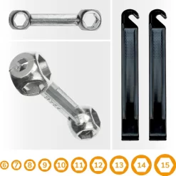 - 1 platte moersleutel in de maten 8, 10 en 15 mm. + spakenspanner