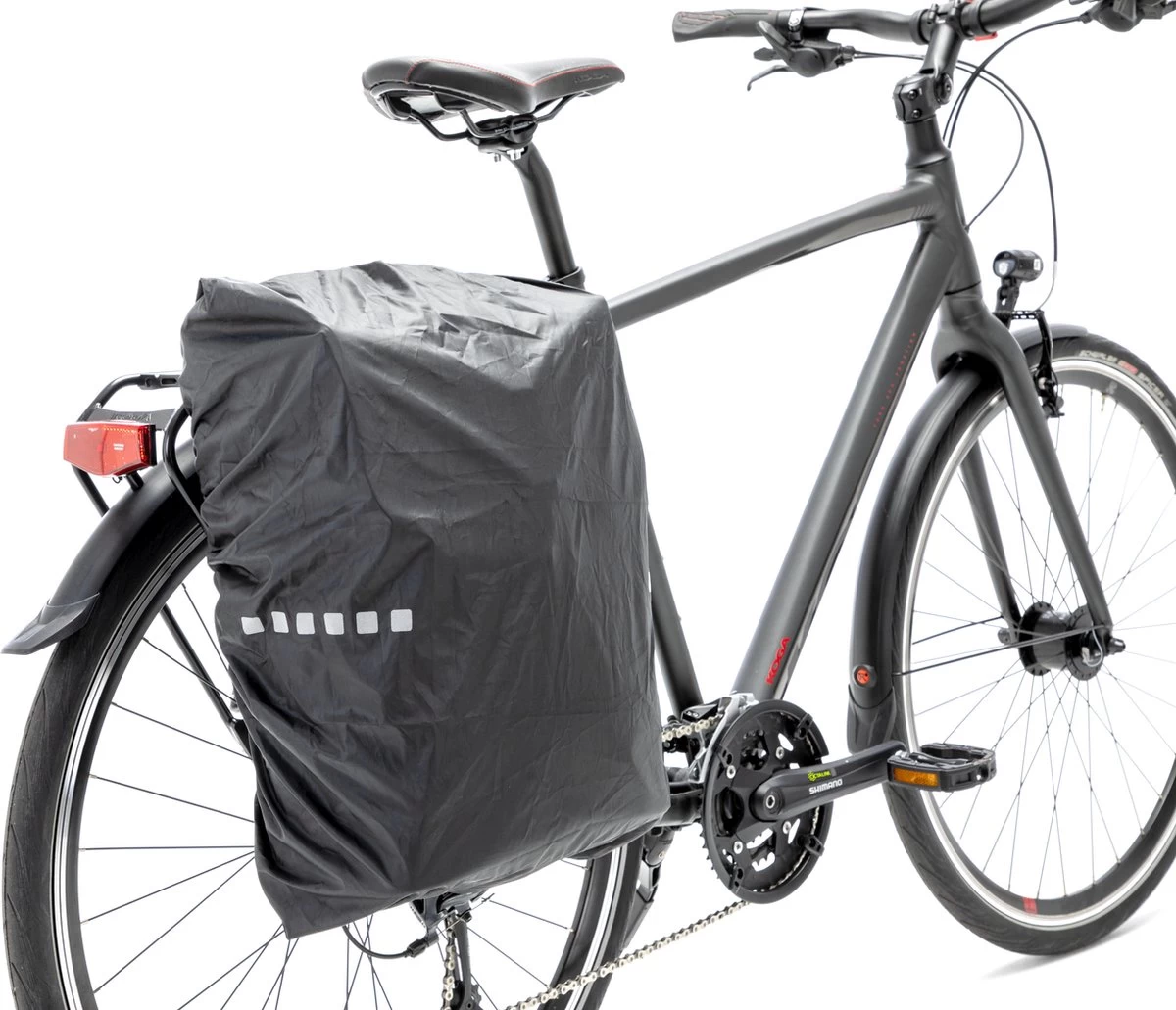 De schouderbanden stop je onder een elastieken band, waardoor de schouderbanden niet tussen de spaken komen. Voor extra veiligheid én een schone tas gebruik je de extra hoes voor de achterkant van de tas.