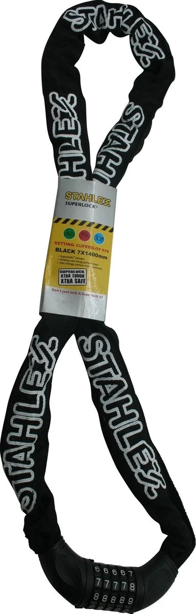 Dit ketting cijferslot is ideaal om uw tweewieler veilig en gemakkelijk op slot te zetten. Met behulp van de hoog stalen ketting wordt het voor dieven veelste moeilijk om door de ketting heen te komen, dat maakt uw fiets natuurlijk een stuk veiliger. Tevens zit er een stevige canvas beschermhoes om de ketting heen, fietsvriendelijk! Deze ketting cijferslot is van goede kwaliteit en ook bruikbaar als poort-kettingslot of aanhangerslot. Het slot beschikt over de veiligheidscategorie B.