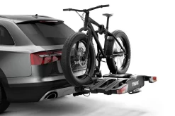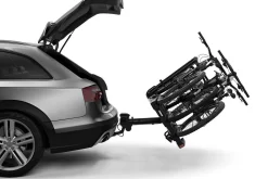 De Thule EasyFold XT 934 Black is gelijk aan de Thule EasyFold XT 934 echter heeft de Black versie een aantal zwarte details zoals op het frame en de afneembare frameadapter voor een unieke uitstraling. De Black is tevens extra compleet; standaard wordt de opbergtas voor extra bescherming meegeleverd samen met de velgbeschermers om de velgen van de fietsen tijdens het vastzetten te beschermen. De Thule EasyFold XT 934 Black is een volledig opvouwbare, compacte en gemakkelijke te gebruiken fietsendrager geschikt voor het vervoeren van 3 fietsen. De Thule EasyFold XT 934 Black is zeer geschikt voor e-bikes gezien zijn laadvermogen van 60kg. Echter passen ook alle overige soorten fietsen perfect. De fietsendrager en de fietsen zijn alle af te sluiten. De fietsendrager stabiliseert zich op de trekhaakkogel wat montage op de trekhaak zeer gemakkelijk maakt. De fietsen worden vastgezet met de afneembare zwarte frameadapters welke zijn voorzien van een koppelbegrenzer zodat u weet dat de fietsen vast staan. De pompgespen met extra lange straps kunnen wielen van maximaal 4.7inch vastzetten. De Thule EasyFold XT 934 Black is kantelbaar door middel van het voetpedaal. Kantelen kan tevens met de fietsen op de Thule EasyFold XT 934 Black wat de toegang tot de kofferruimte vergemakkelijkt. In opgevouwen staat is de Thule EasyFold XT 934 Black handig te vervoeren door de geïntegreerde handgrepen.