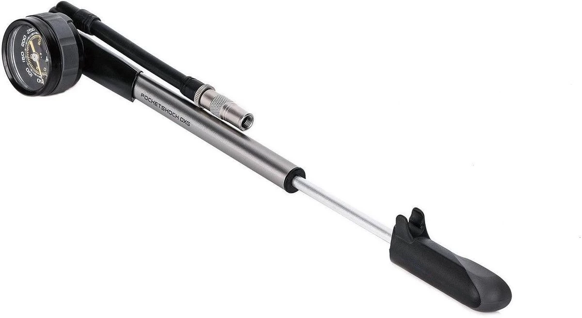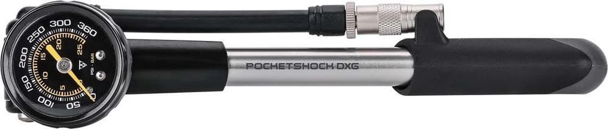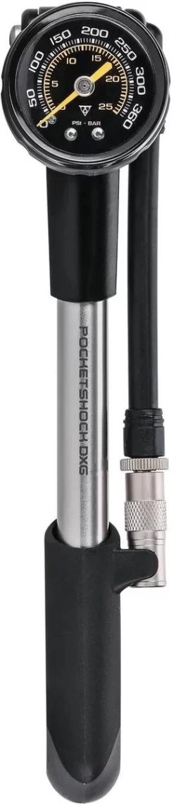 De Pocket Shock DXG een schokpomp met een gemakkelijk af te lezen meetklok voor nauwkeurige drukmetingen tot 360 psi 24,8 bar. Een nauwkeurige vork- en demperpomp voorzien van drukmeter met carbon wijzerplaat voor accurate drukmeting. Met het bleeder-ventiel en de Pressure-Riteâ„¢ connector is het eenvoudig om de juiste druk af te stellen en het voorkomt luchtverlies bij afkoppelen.